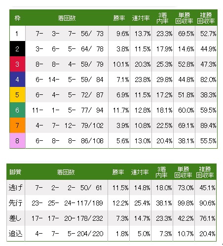 最初のコーナーまで距離があるので枠順の有利不利は少ないが、若干内枠が有利。外回りコースでペースが落ち着きやすいため、前残りになりやすいが、冬場の最終週で馬場の内側があれている場合には、外枠や差し馬にも注意が必要。