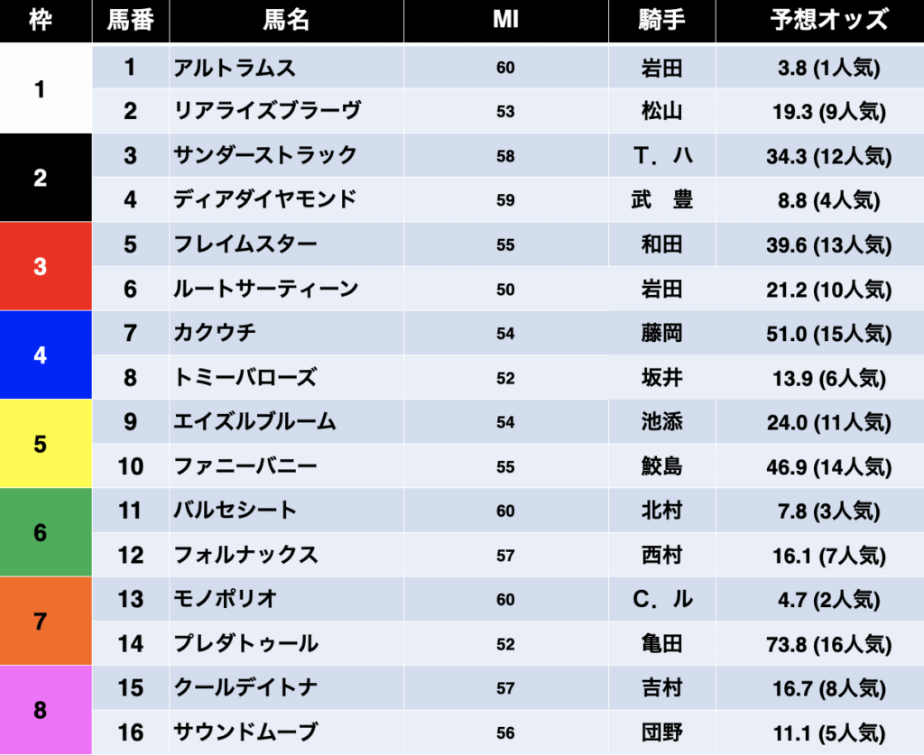 | 着順 ↕ | 馬番 ↕ | 馬名 ↕ | mi ↕ | 性齢 ↕ | 斤量 ↕ | タイム ↕ | 基 ↕ | KP ↕ | BP | AP | TP |