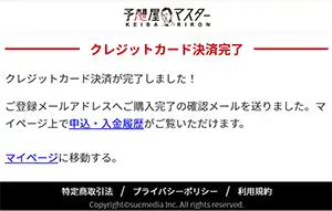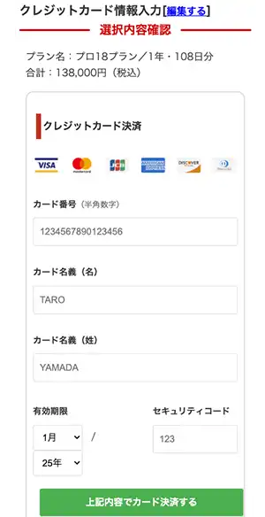 有料予想プランを選択し、クレジットカード購入ページへ進みます。必要な情報を入力後、「上記内容でカード決済するボタン」を押します。