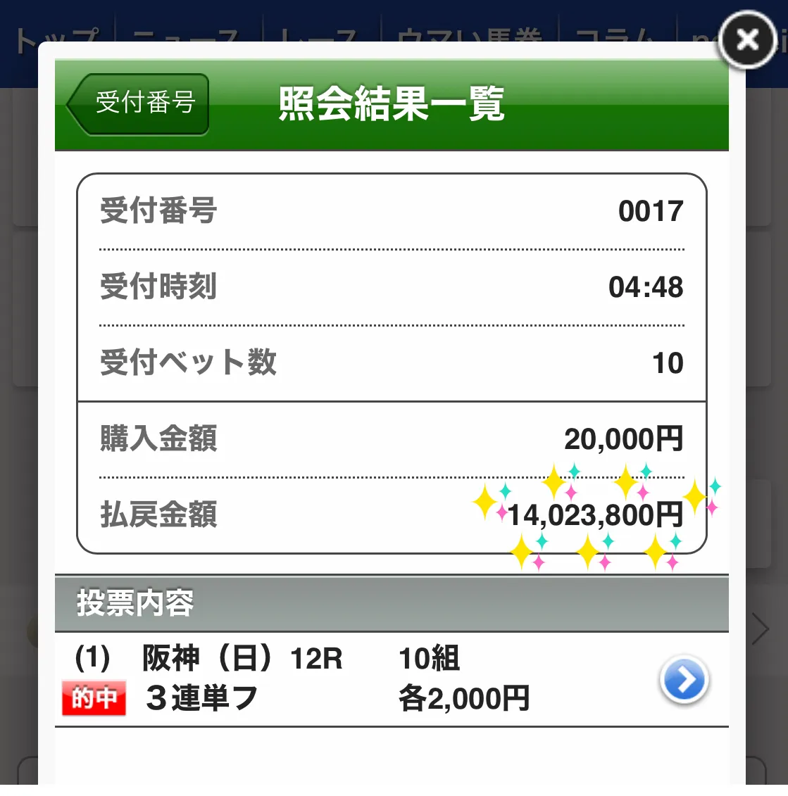 また、このような「期待値が高い馬券」を購入し、2020年3月に1400万円超えの払戻しを手にした会員様のご報告をご覧ください。