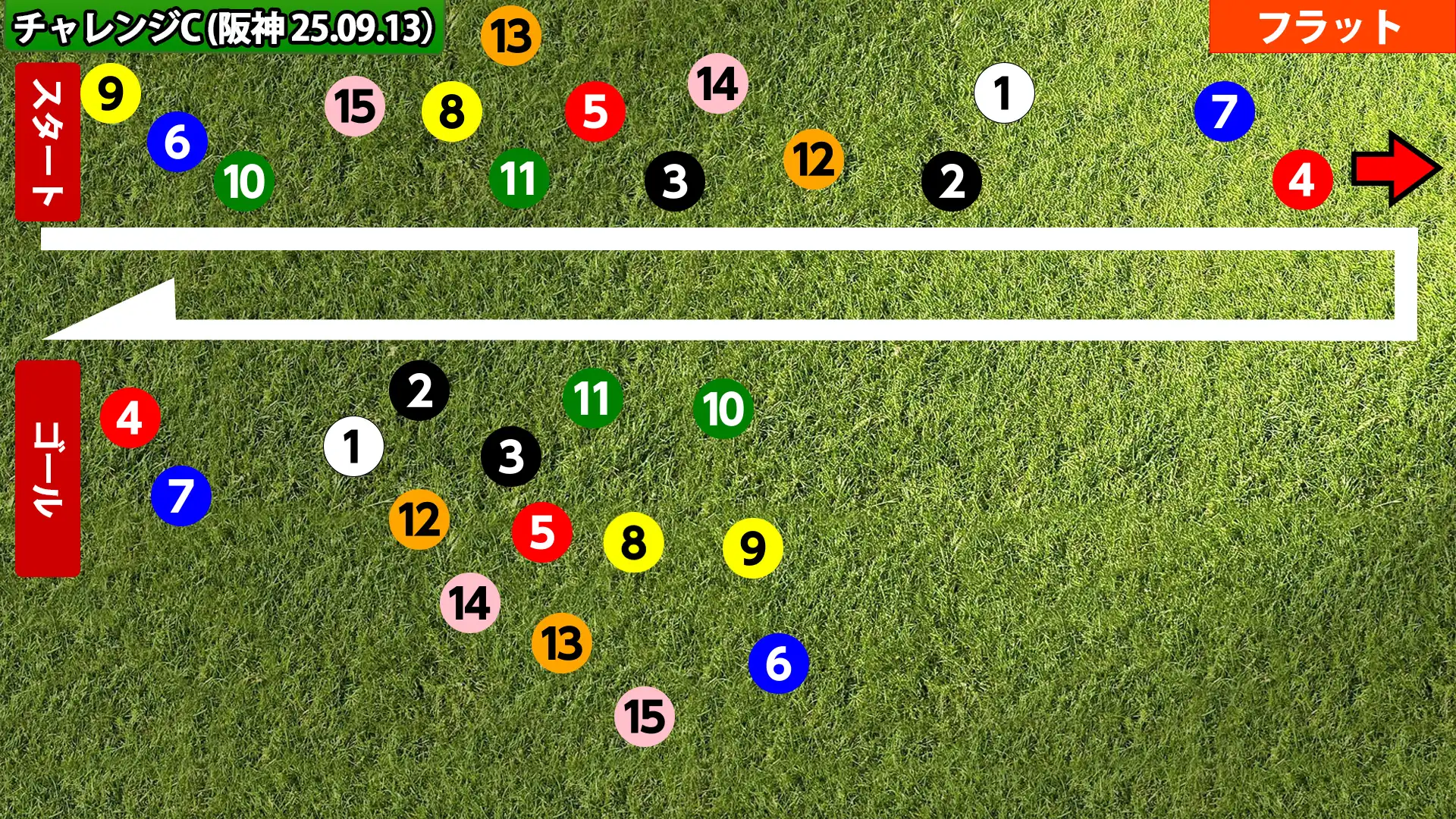 トラックバイアスとは切り離して、ぺースを考慮します。例えば、スローペースで明らかに前残りの展開になった場合、逃げ先行の馬は恵まれたとし基礎点に対して△1~3pt補正。後方から差し損ねてしまった馬は脚を余したとし基礎点に対して+1~3pt補正。逆に、Hペースで前崩れの展開バイアスが発生した場合、真逆の補正をします。