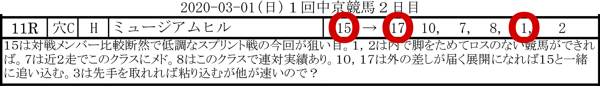 [的中!] 馬単15-11/2,430円(8番人気)