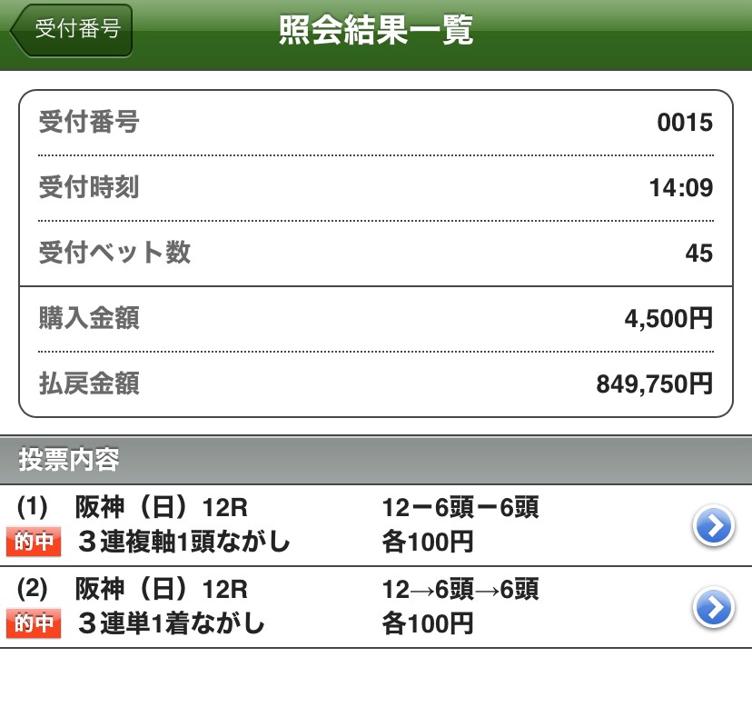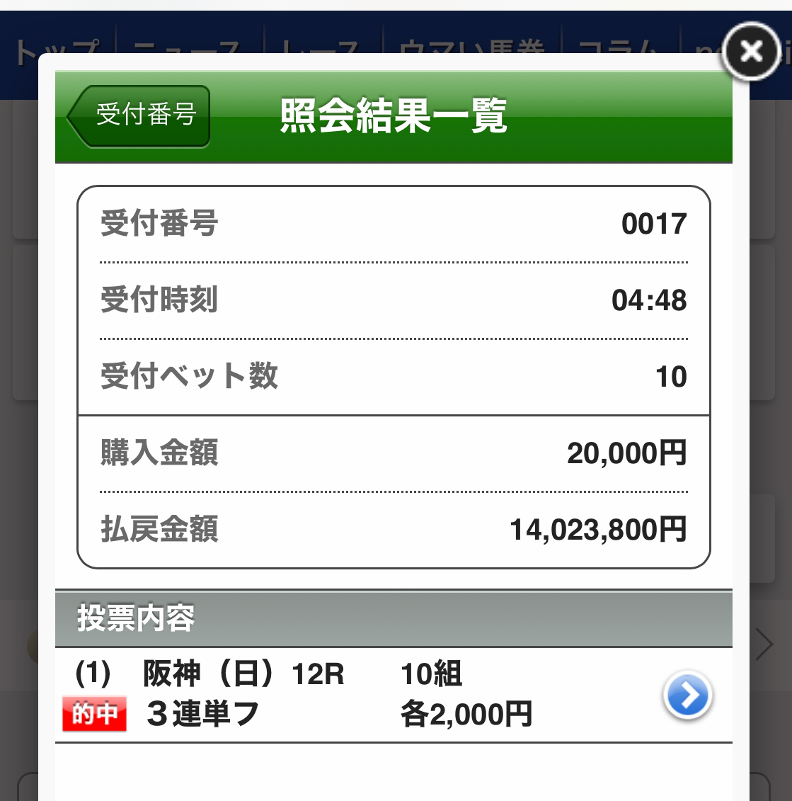 いつもお世話になっております。 しばらく私事で忙しく競馬どころではなく休会しておりましたが、久しぶりに再開してすぐにこれ… マジヤバくないっすか?笑 昨日の予想では他の低配当はすべて見送って阪神10Rと12Rのみ馬券購入したらまさかの80万勝ち!父と母をゆっくり温泉に連れて行ってあげたいと思います! マスター本当にありがとうございました!