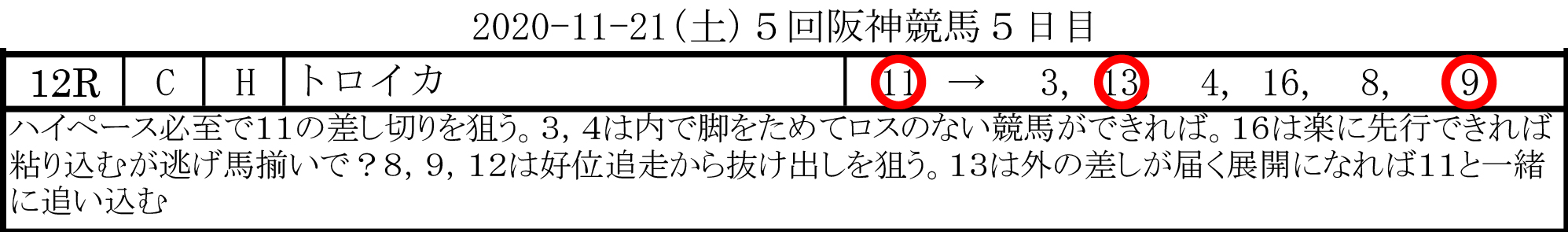 先行馬が揃い、ハイペース必至で11番トロイカ(1番人気)の差し切り、と予想したマスター。