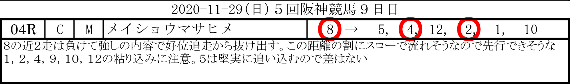 出走メンバーから見て、先行勢激化のレース、逆に先行勢がいないレースなど、展開の見極めが流石でしたね。