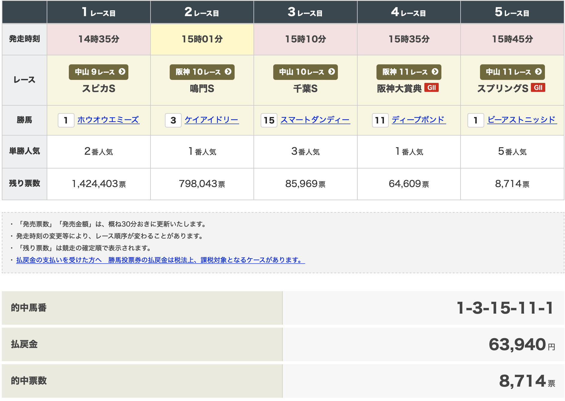 | 阪神 | 10R | 3,9,15 | 10 | |