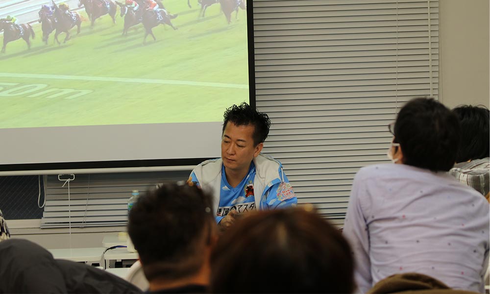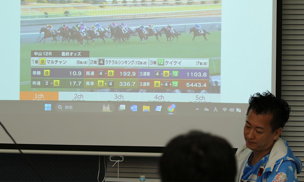 (予想した各レースを解説するワンシーン。淡々とそして来場の会員様のペースに合わせ解説していく)