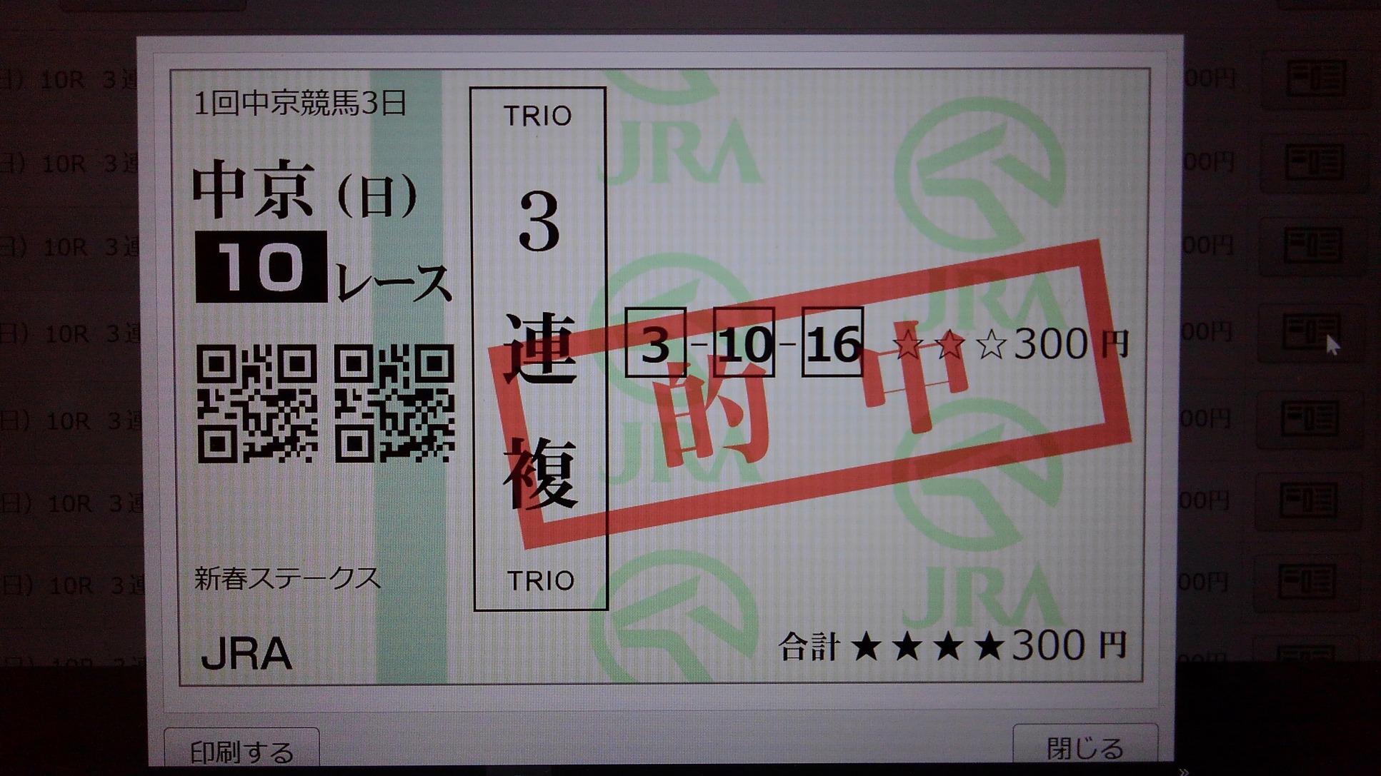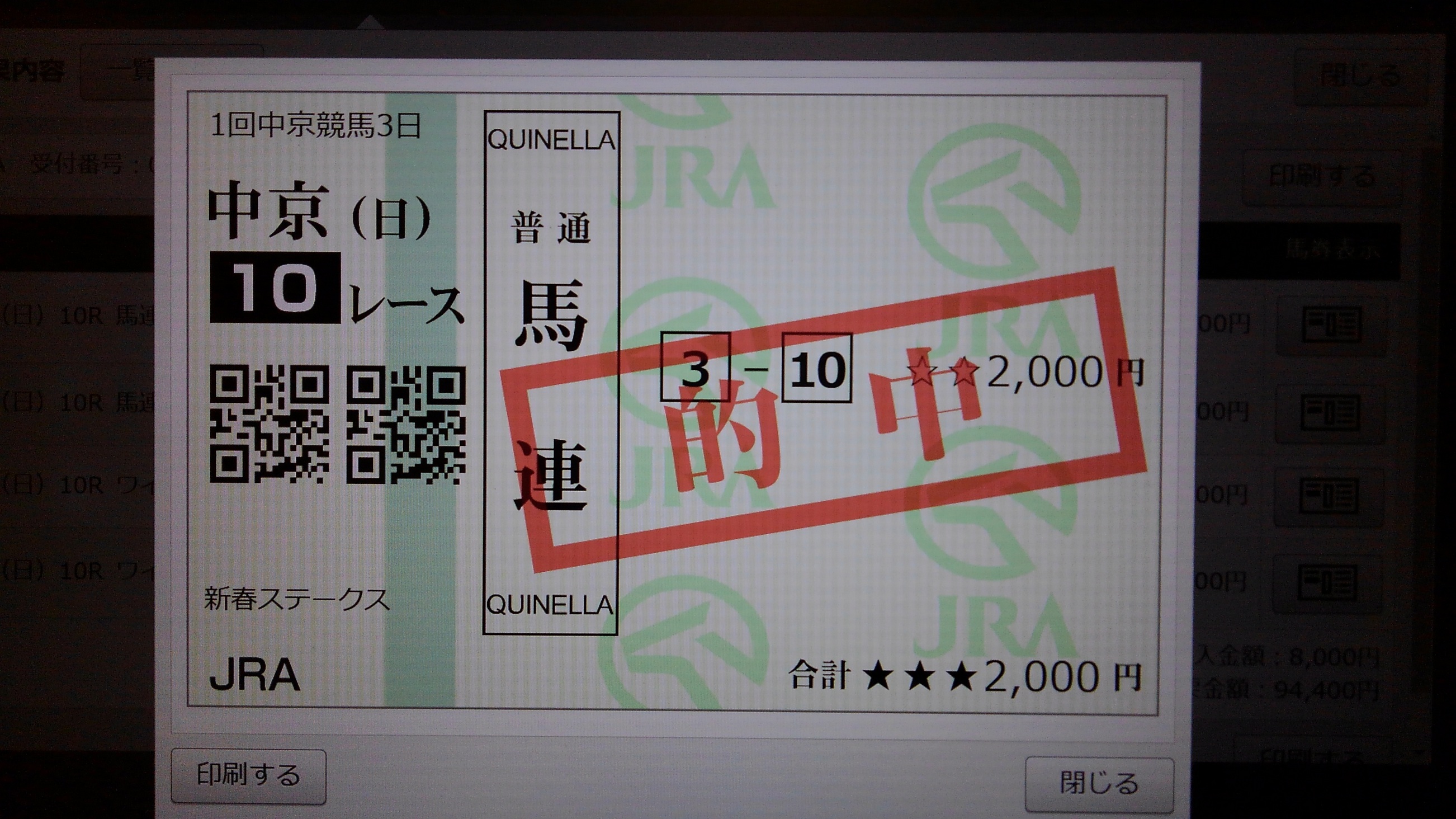 中京10R(新春ステークス)ありがとうございます。ばっちりでしたね。