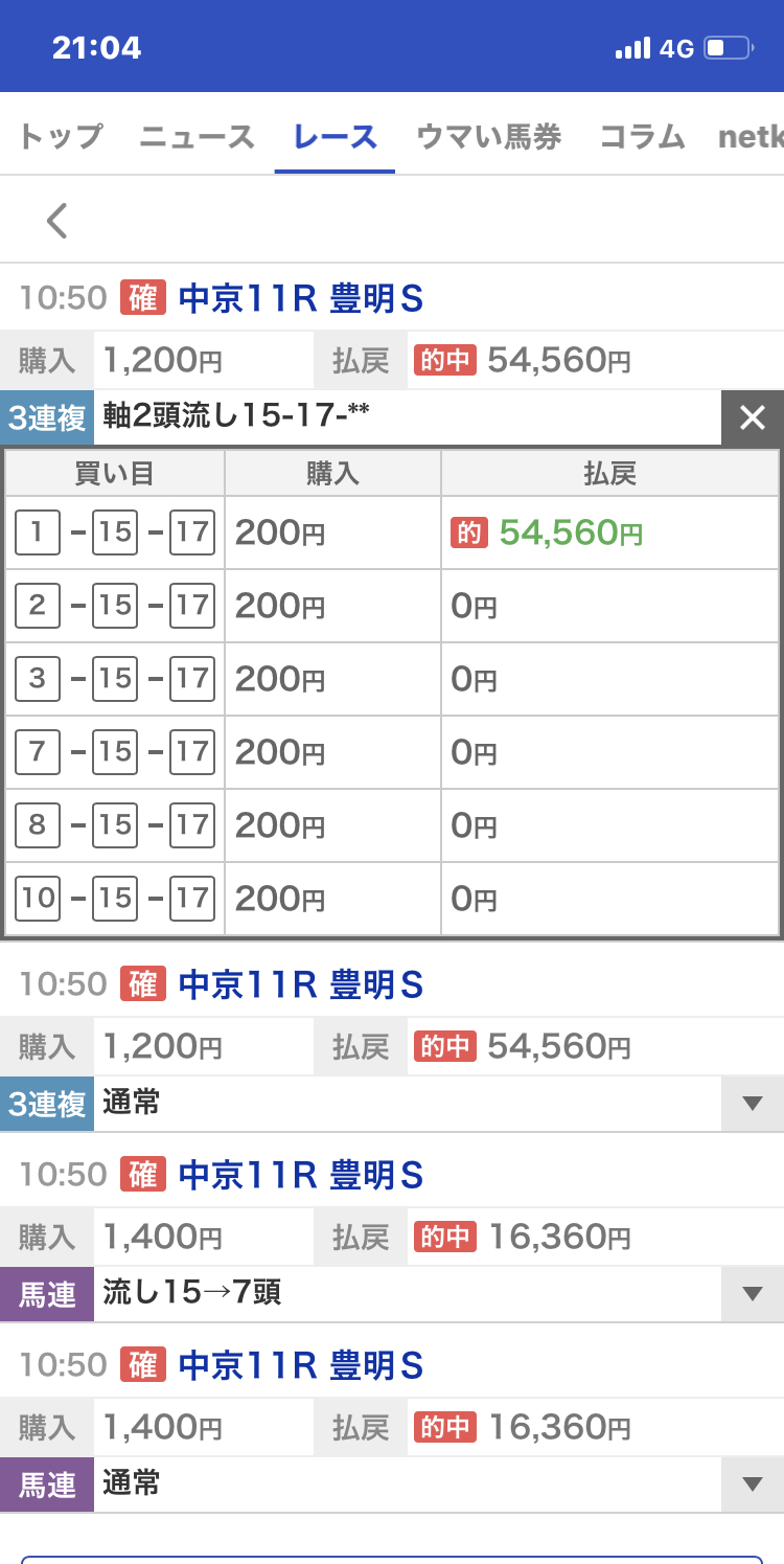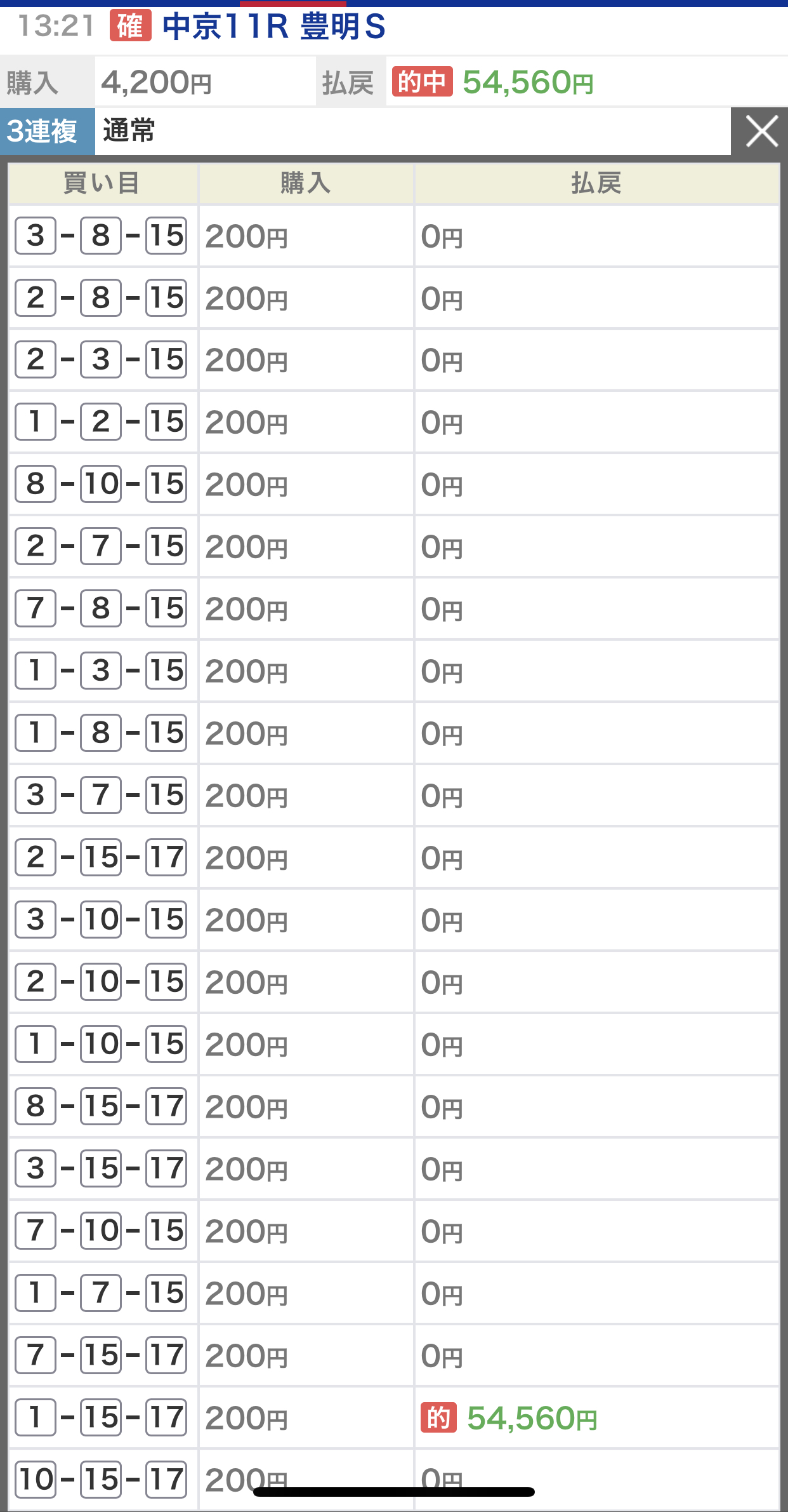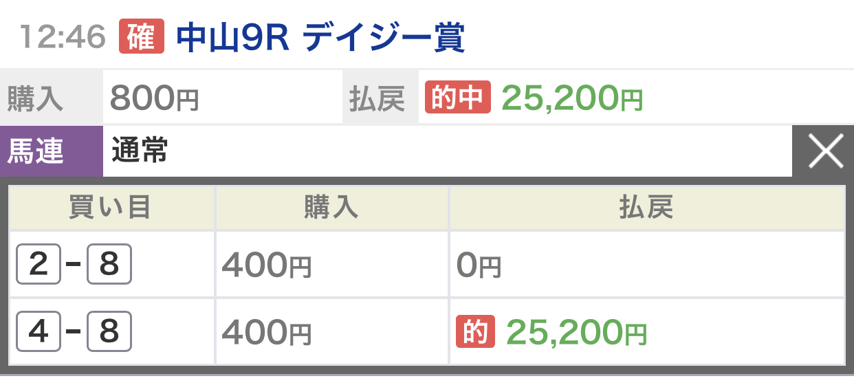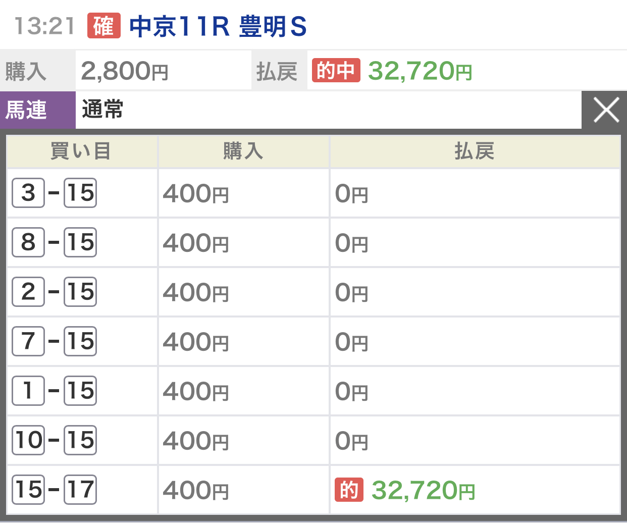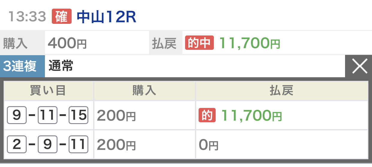 配当が低いレースが多い中、驚きの的中率でプラス収支となりました。 ありがとうございます。