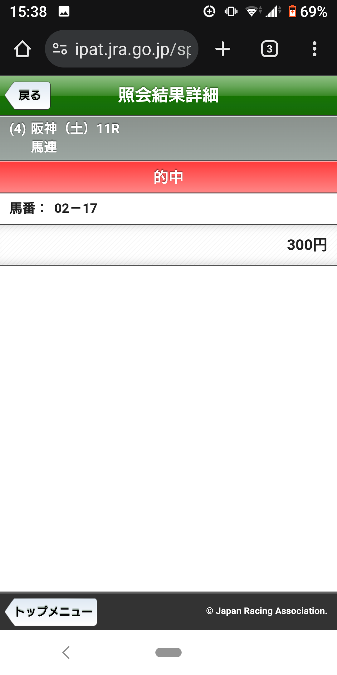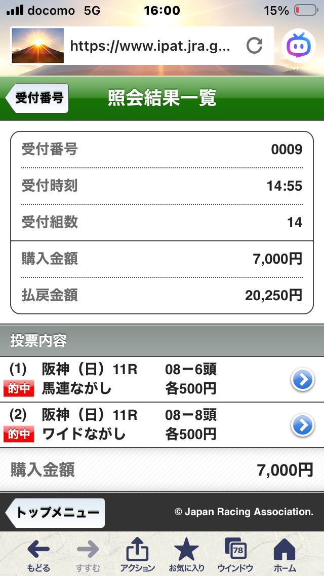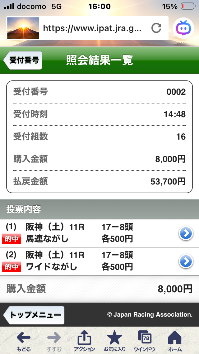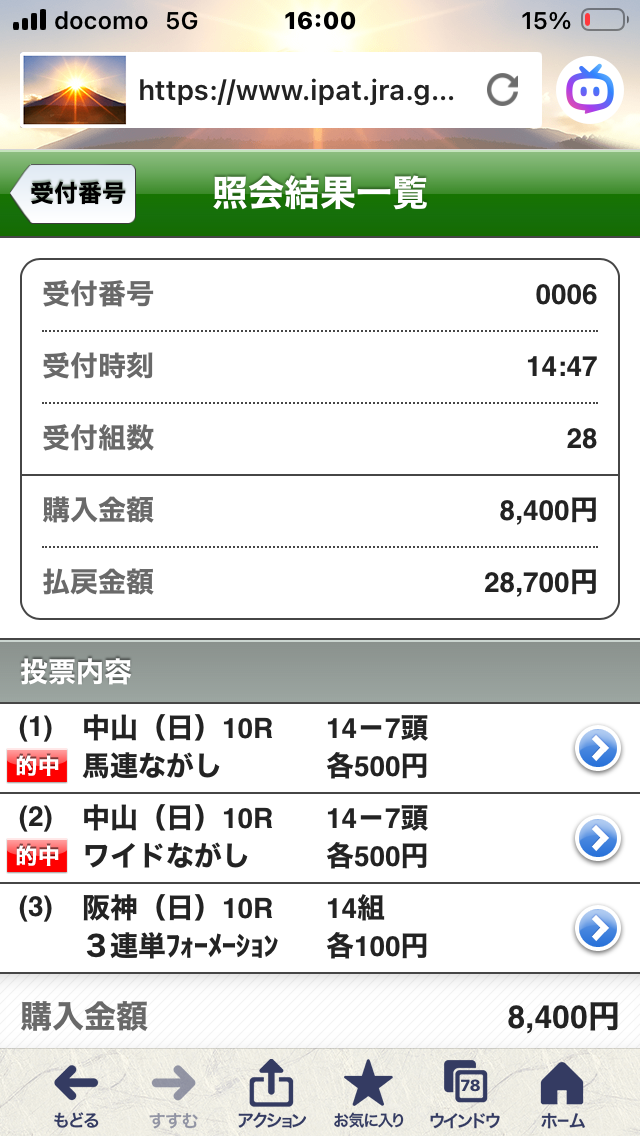 中山10Rの三連単高配当的中させていただきました!ありがとうございます!