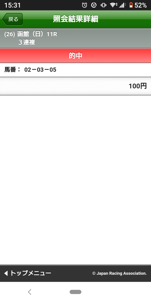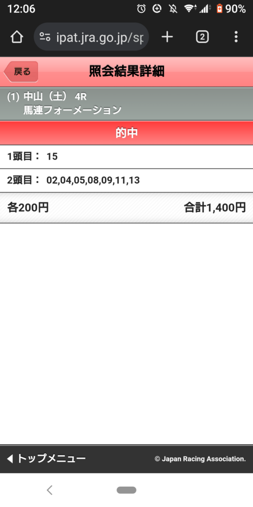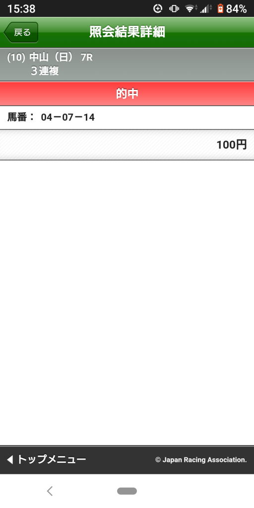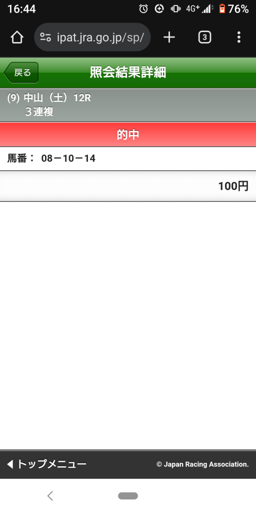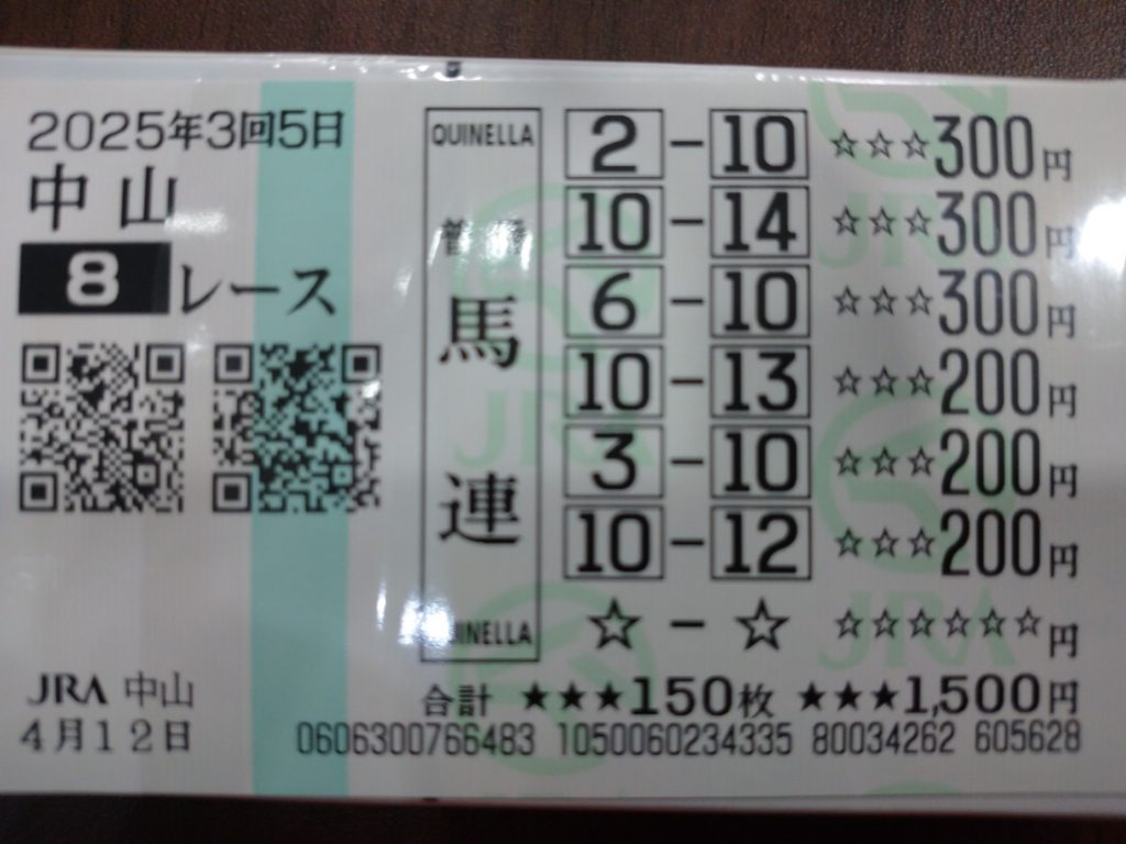 昨日、中山競馬観戦でレースを絞り、高配当を的中しプラスで終えることが出来ました。有難う御座いました。(中山10R :x印抑え候補含む3連復)