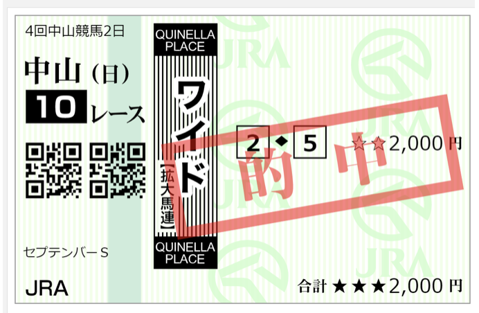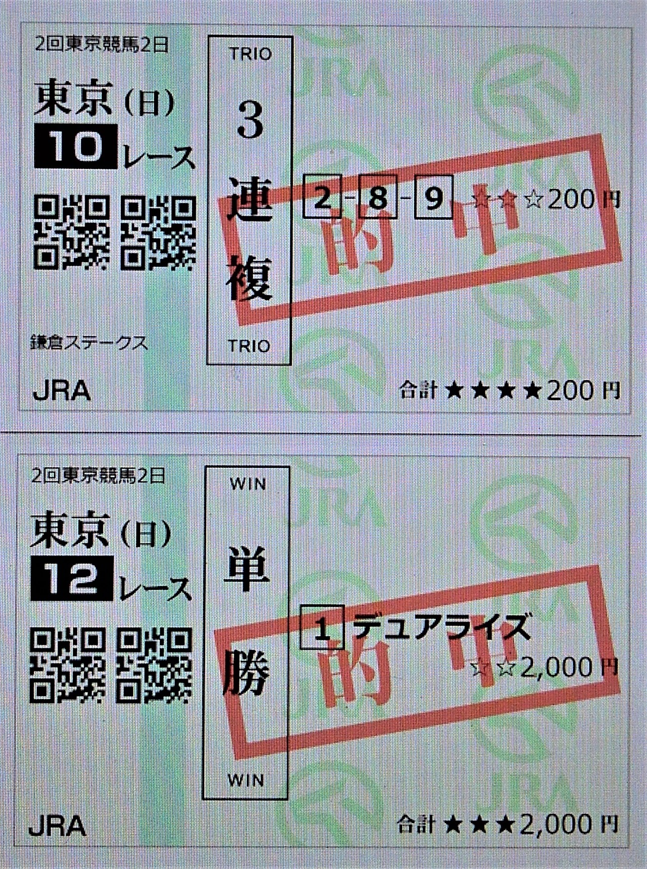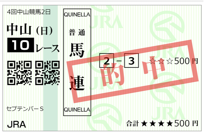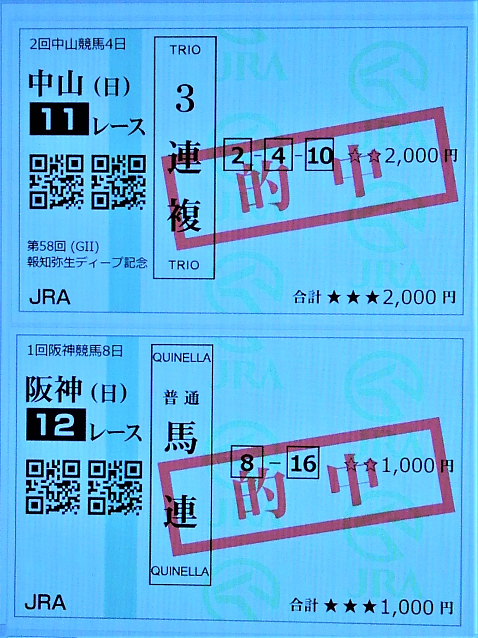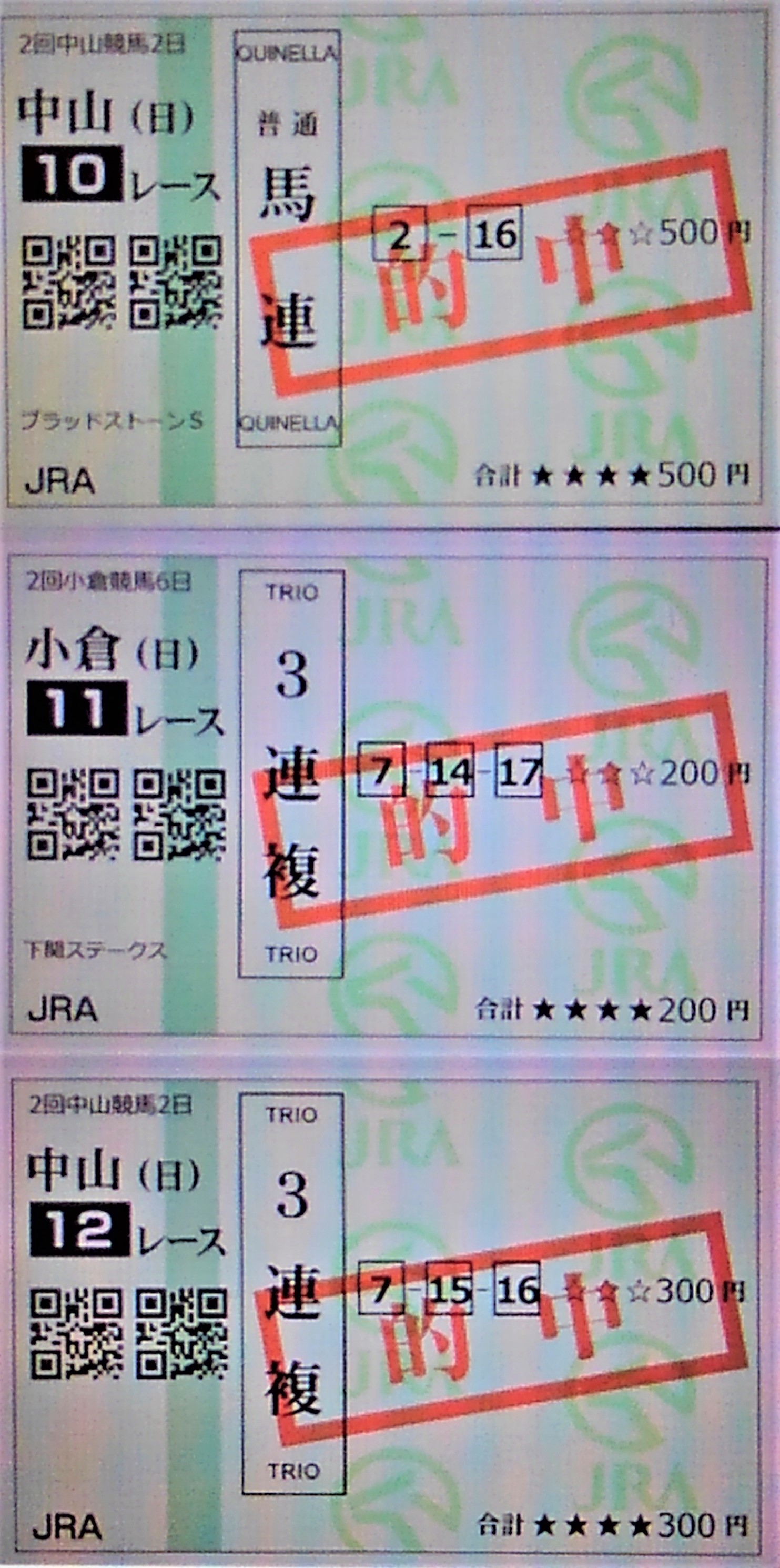 こんにちは。本日も10Rからの参戦でした。 中山ラスト、マスター予想を参考に応用して勝てました。三連複・馬連を戴きました!!今日もプラスで終了です。いつも本当にありがとうございます。引き続きどうぞよろしくお願いします。