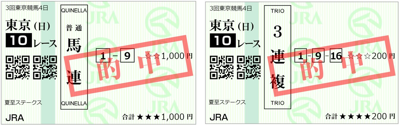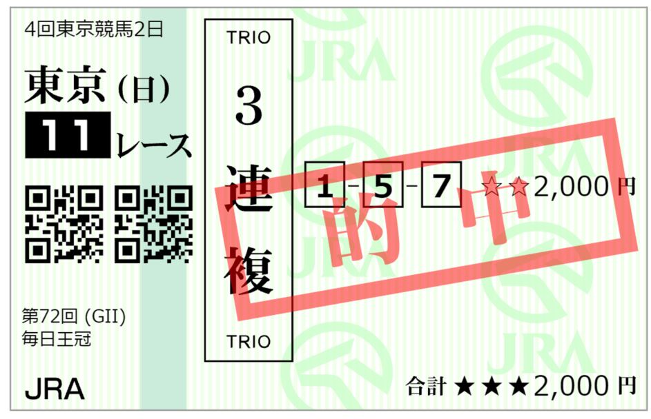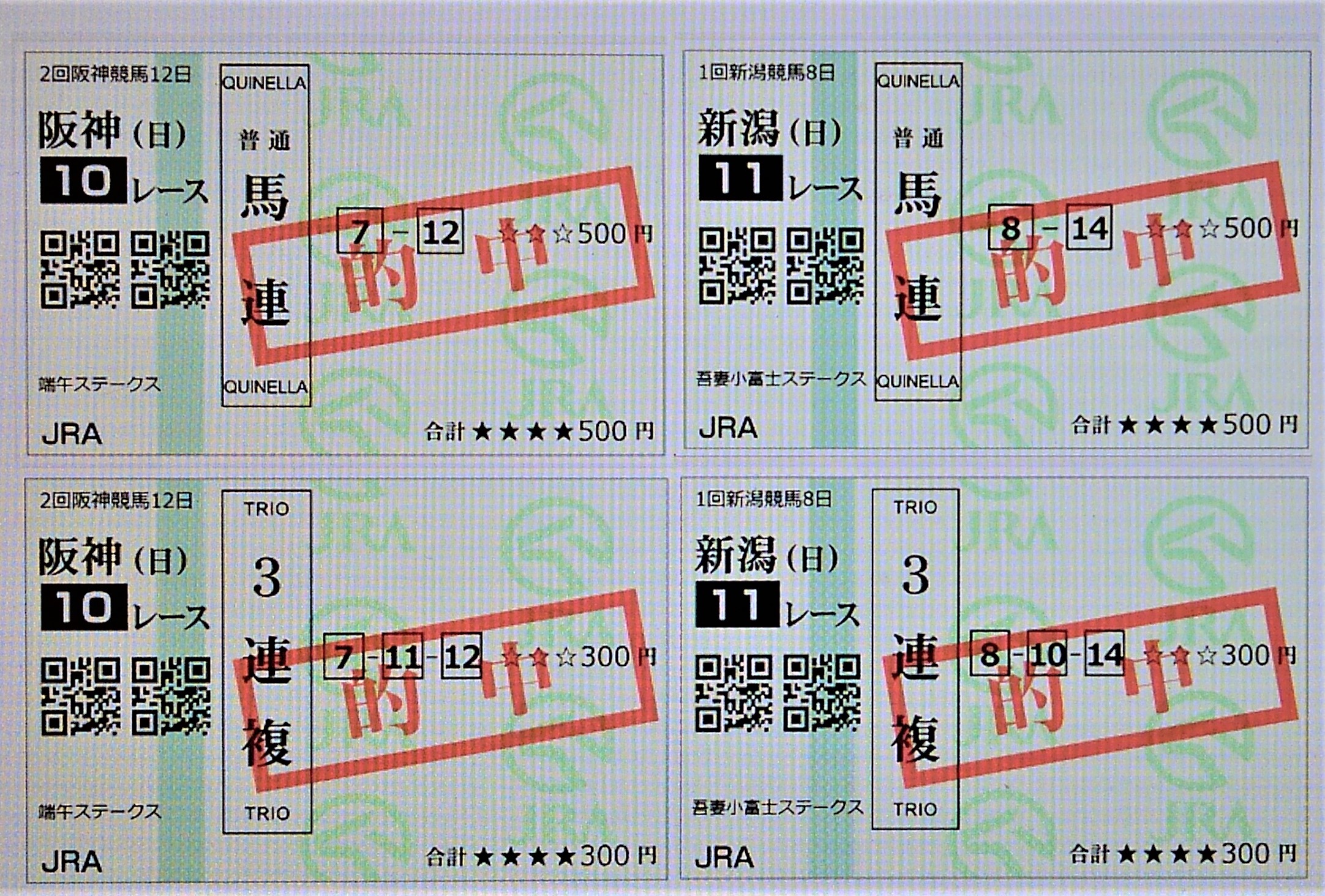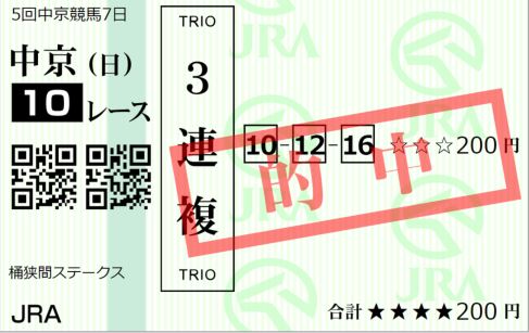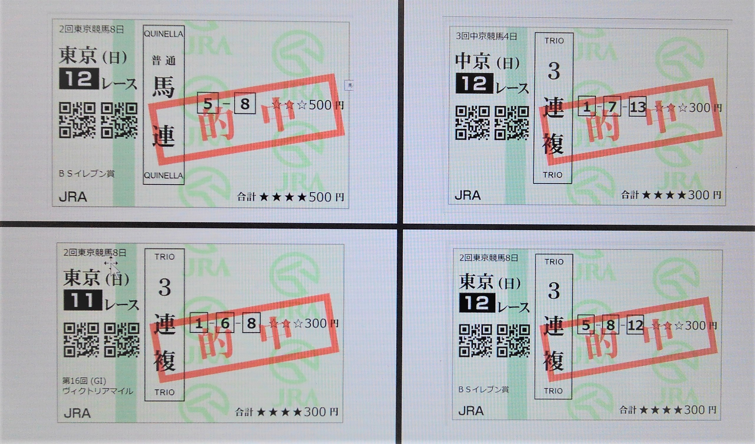 マスター今日もありがとうございます。今日は東京10R・11R、中京11R、札幌11Rの4レース勝負をしました。東京10R、マスター本線の馬連とアレンジを加えた三連複を獲ることができました。ありがとうございます。