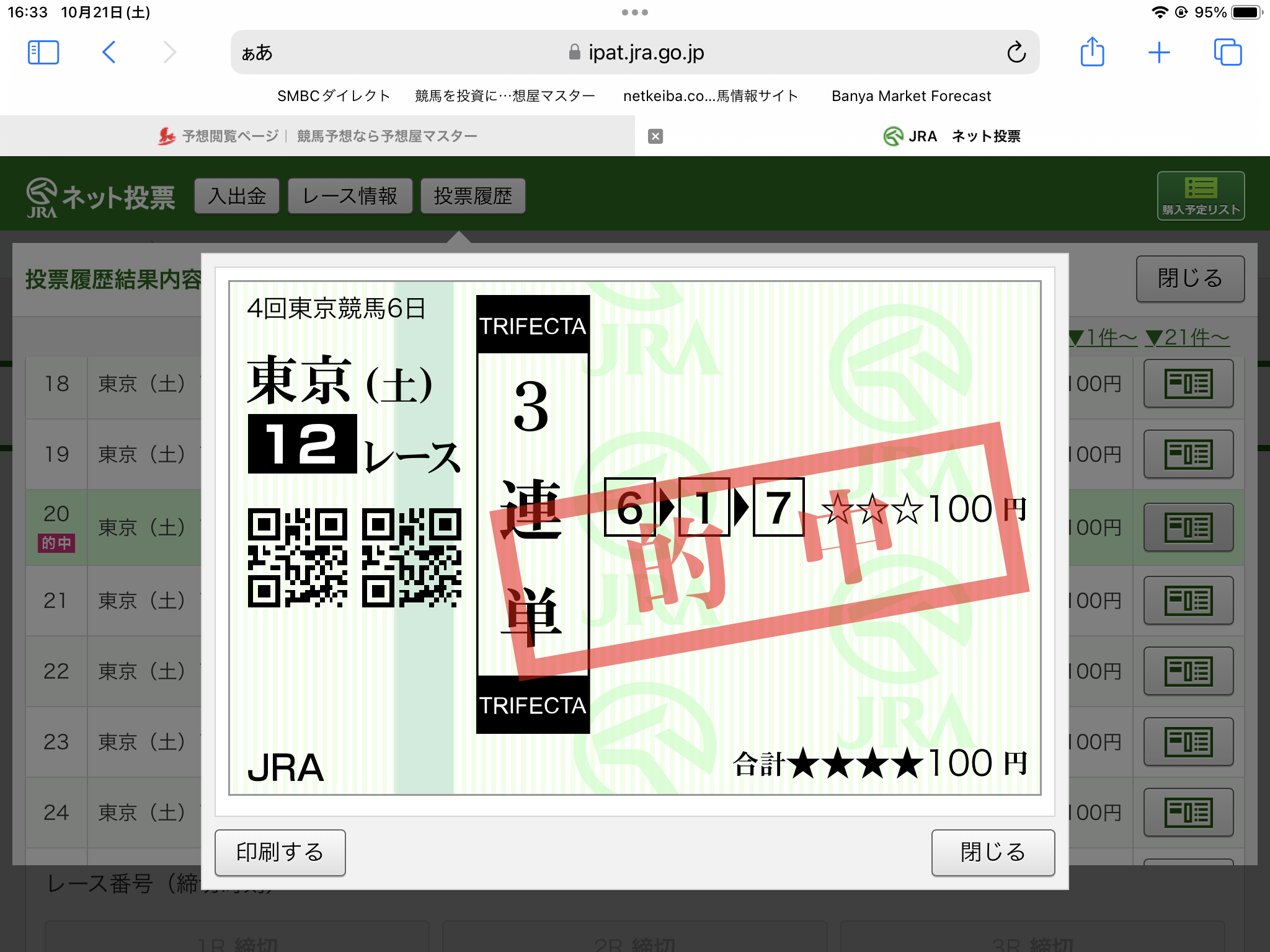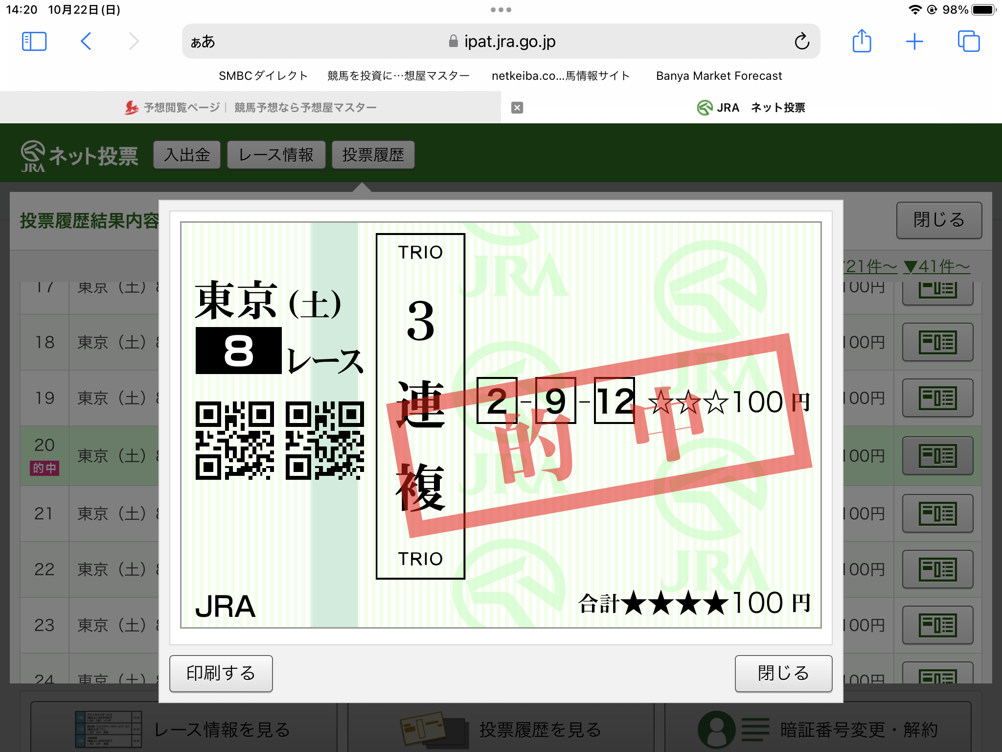 小倉10R、3連複が何故か的中してました。紐馬番転記ミスと★軸の高配当絨毯爆撃によるものでした。とはいえ★軸がないと自力では当たりませんでした。複勝だと完全的中です。