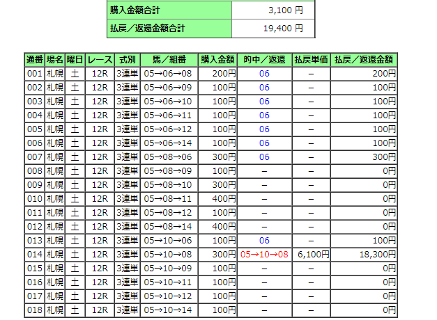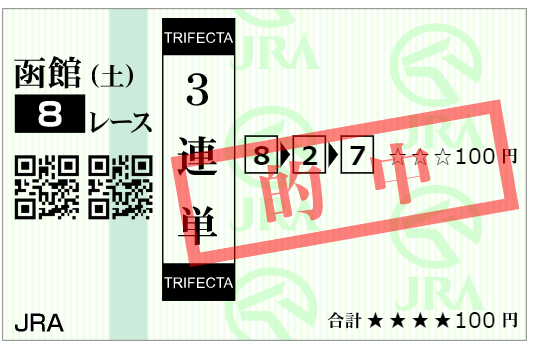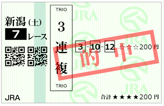 今週もお疲れ様でした。7月は雨が多く芝は馬場が読みにくい開催が続きますね。馬券はダートを中心に購入しマスターの買い目をベースに3連単が沢山とれて 7月だけで70万ほどの払い戻しが的中できました。ありがとうございます。夏競馬は穴馬が多く好走するイメージが多いのでマスターの伝家の宝刀穴Cレース楽しみにしています。^^ (前半のレースはマスター予想の提供外でしたが、マスター予想のノウハウを習得・応用して、的中できるようになりました)