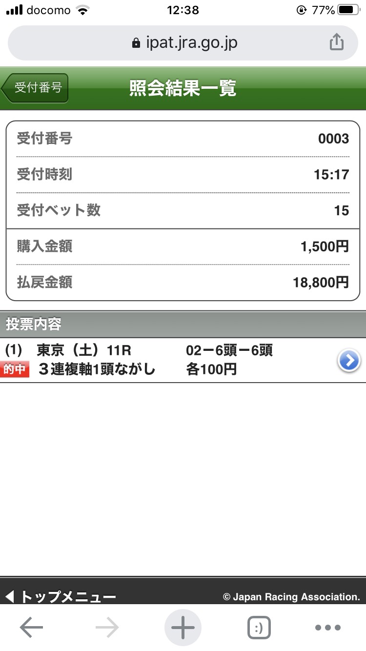 お世話になっております。マスターの予想のお陰で3連複的中しました!