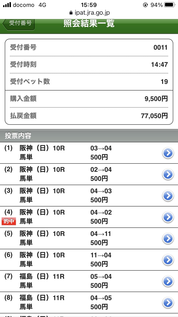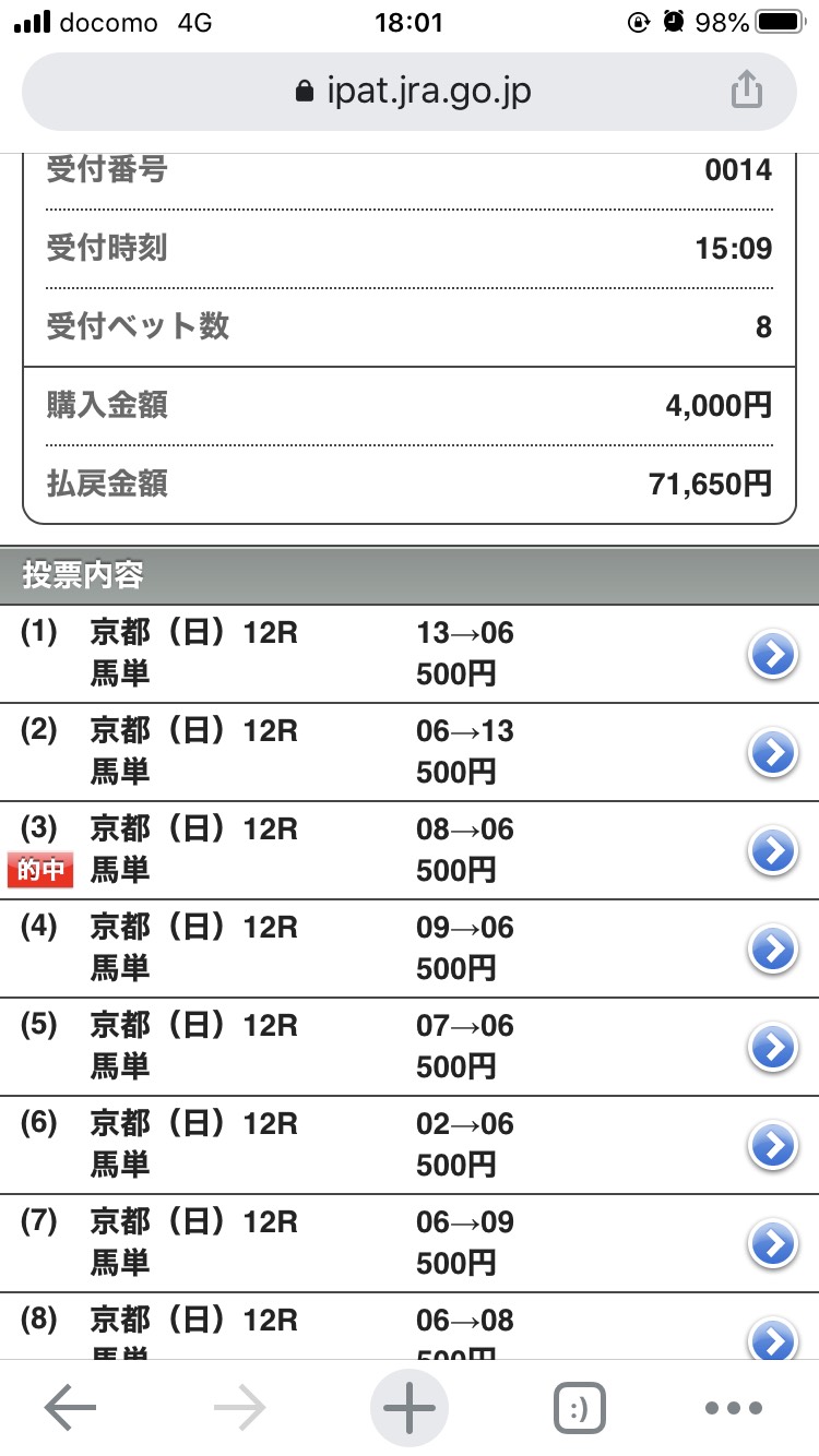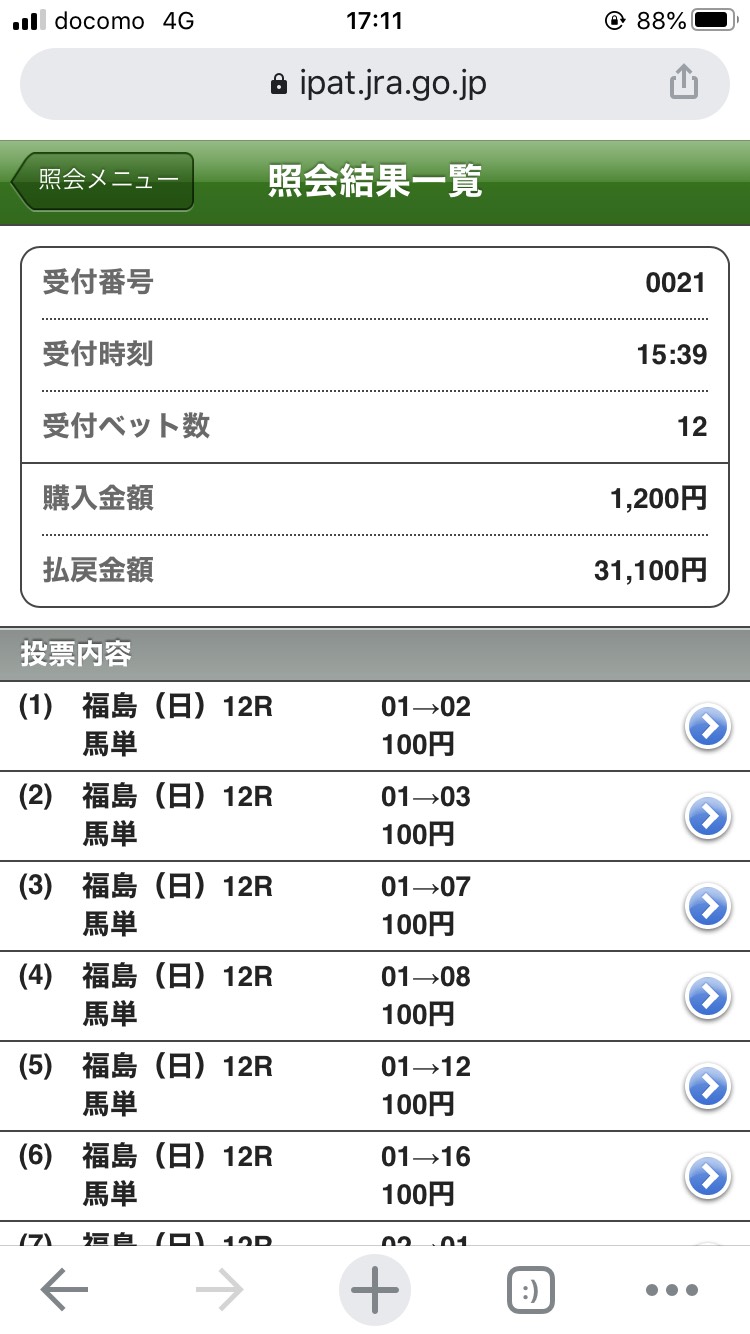 いつもは3連複しか買っていないのですが穴Cということで馬単も購入してました、しかもマルチで。