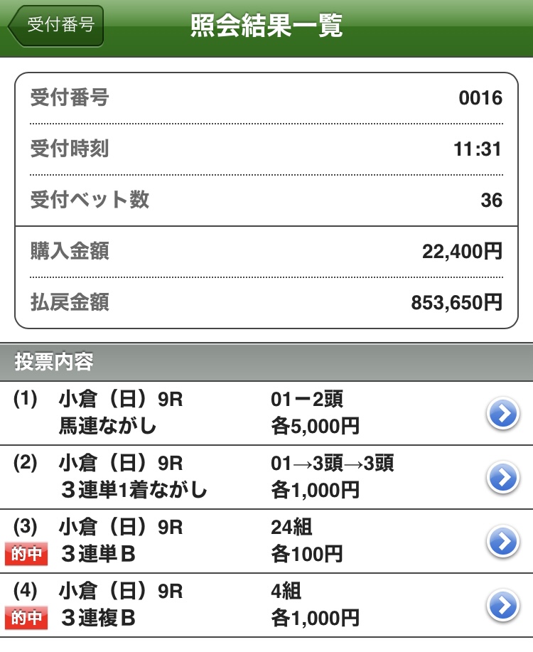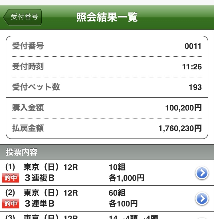 いつもありがとうございます。 2.23.東京11R大爆発ありがとうございました。 G1だけあってオッズの影響も最小限でとんでもない高配当でしたね。 休み明け、無事に銀行に入金されておりました(笑) 実は、前週2.15.東京12Rも軸馬は来ませんでしたが、 コメントから追い込み馬のBOXで三連複(982.7倍)と三連単(615.4倍)の超高配当も 取らせていただき、ひそかに爆発していたところでしたので二週連続の神降臨。 昨年11〜12月もいい思いをさせていただきましたが、2月はさらに大変なことになりました。 これからも変わらず素晴らしい予想を心待ちにしております。 |