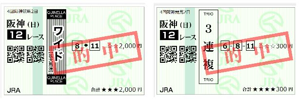 マスター殿 こんにちは。 本日も本当にありがとうございます。お陰様で、阪神12Rをバッチリ獲らせてもらいました。 ワイド8-11(馬連、ほんとに惜しかったです。ただ35倍以上付いていたのでワイドを抑えていてよかったです) 三連複は、ちょっとアレンジを利かせて獲ることができました。 明日、阪神競馬場に行きますのでじゅうぶんな軍資金ができました。 感謝しています。