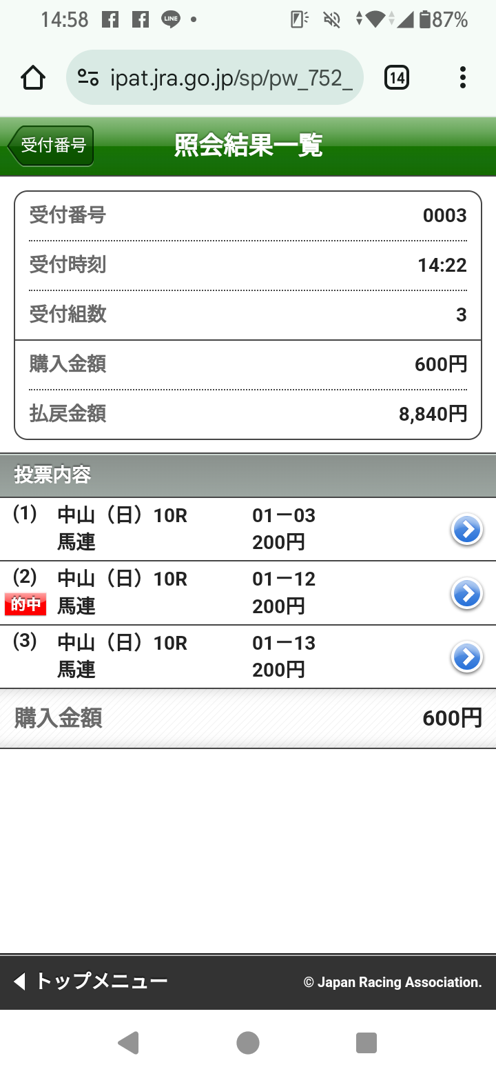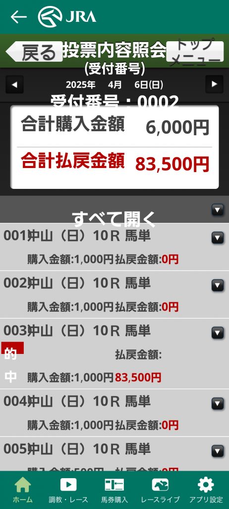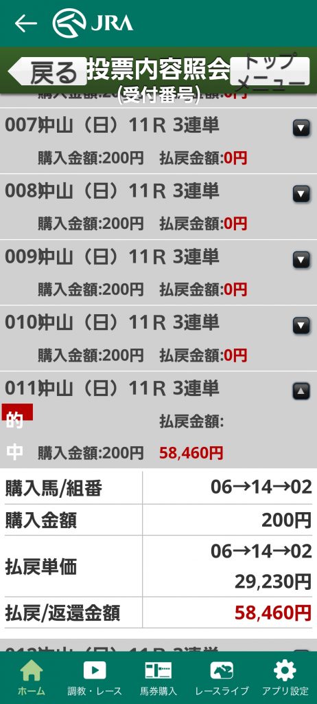 いつもお世話になっております。中山10R、中山11R馬単高配当的中させていただきました!ありがとうございます!中山10Rは3着が抜けて残念でしたが、また次回期待しています!ちなみに阪神5Rも三連単的中させていただきました。ありがとうございます。来週も楽しみにしています。引き続きよろしくお願いいたします。
