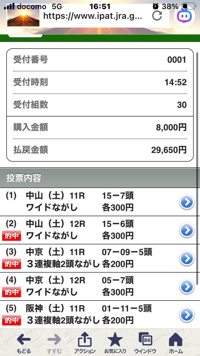 三連単20万馬券的中させていただきました!ありがとうございます!