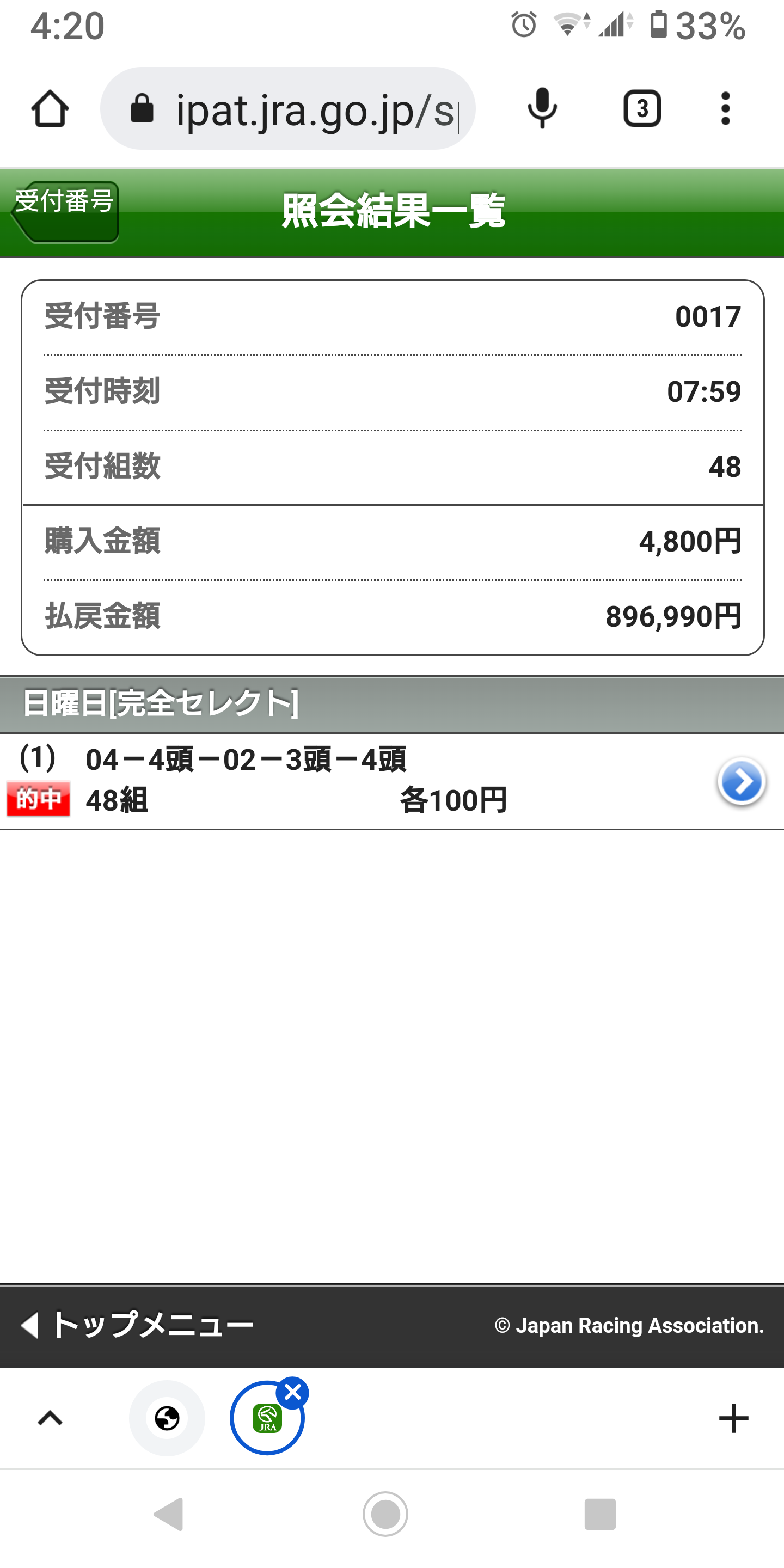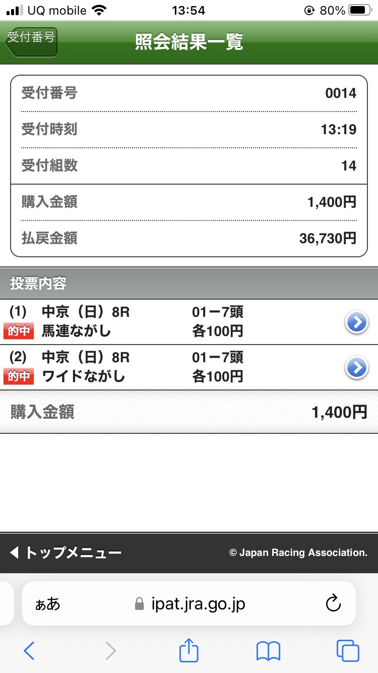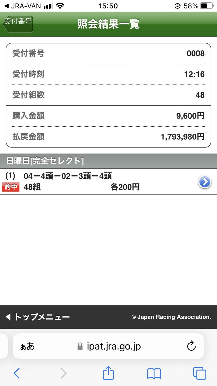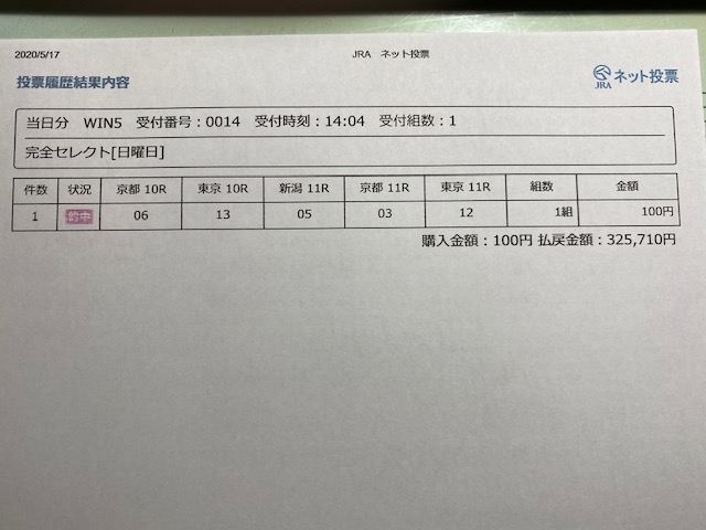 まだ初回で、しかもWIN5でこのような結果が出た事が 私の中で絶対に起こり得なかったと思っています✨。 取り急ぎご報告となりますが 来週もまた浮かれずに 丁寧に購入したいと思います。 ありがとうございました!